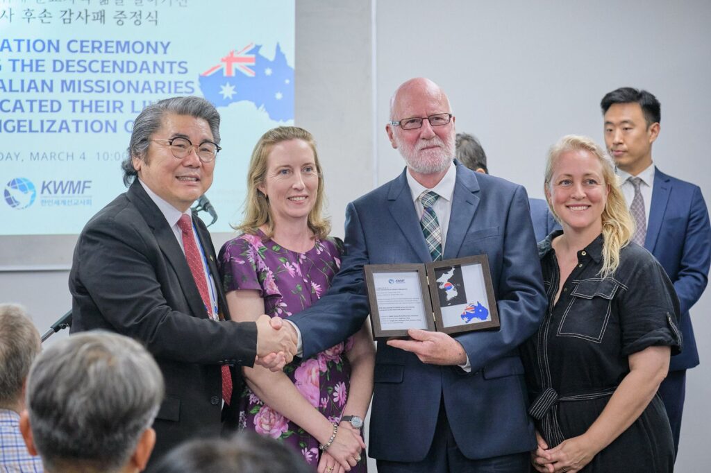 한인세계선교사회(KWMF)는 3월 4일 오전 10시 시드니에 위치한 호주장로교회 사무실에서 ‘한국복음화를 위해 순교자적 삶을 살아가신 호주 선교사 후손 감사패 증정식’을 개최하고, 한국 선교 역사에 헌신한 호주 선교사들의 후손들에게 감사패를 전달했다.